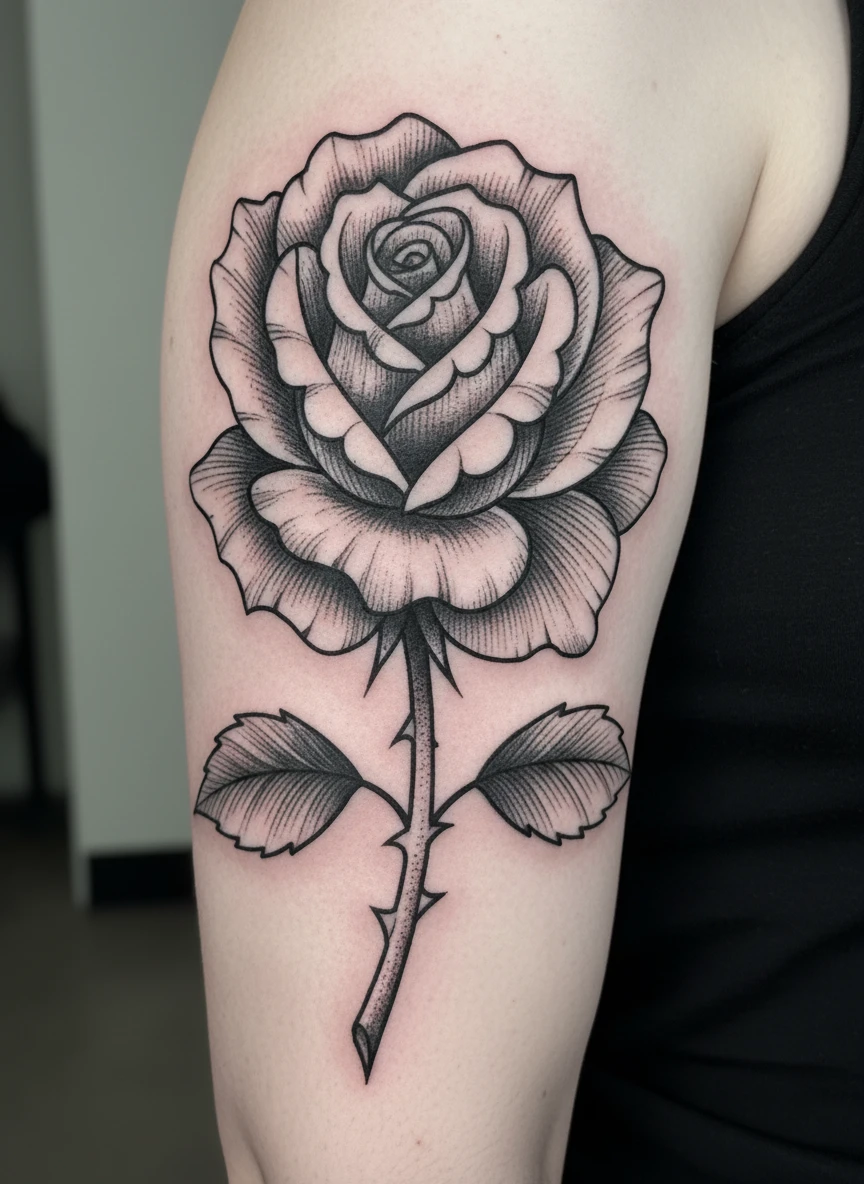 Birth Flower tattoos Generator interpretation of a June rose in classic blackwork tattoo style. Bold yet refined outlines define layered petals, balanced with controlled shading for depth. Designed to feel timeless and symbolic rather than ornamental. blackwork, classic, bold-lines, floral-symbolism — NEG: color fill, blurry edges, over-detailing, weak contrast, distorted anatomy