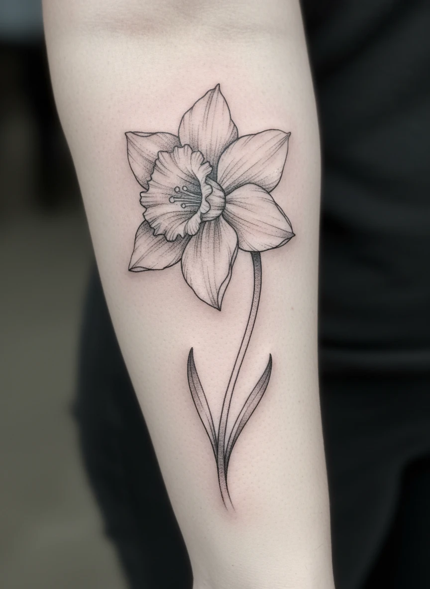 Birth Flower tattoos Generator showcasing a March daffodil in refined botanical linework style. The stem curves naturally with realistic petal layering, evoking renewal and spring. Executed as a timeless black-and-grey tattoo suitable for inner arm placement. botanical, linework, black-and-grey, elegant — NEG: flat design, thick outlines, abstract shapes, color splashes, low realism
