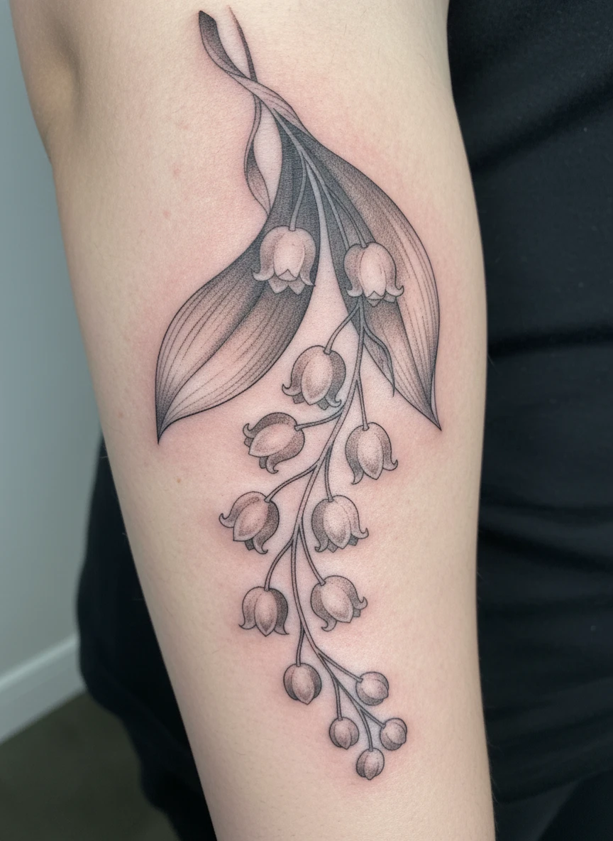 Birth Flower tattoos Generator featuring May’s lily of the valley in a graceful hanging composition. Fine detailing highlights the bell-shaped blooms with soft gradients and elegant flow. Ideal for a vertical placement along the rib or forearm. fine-detail, graceful, floral-tattoo, soft-shading — NEG: harsh edges, unrealistic proportions, oversaturation, flat lighting, blotchy ink