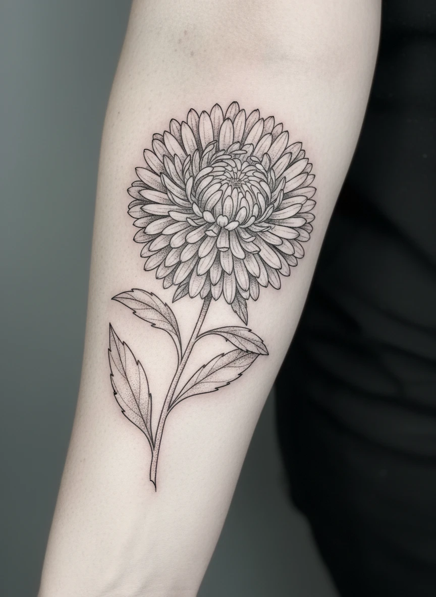 Birth Flower tattoos Generator showcasing a September aster with intricate botanical accuracy. Thin lines and subtle stippling emphasize texture without overpowering the design. Created for a refined, scholarly floral tattoo aesthetic. botanical-accuracy, stippling, refined, fine-line — NEG: cartoon style, heavy gradients, random dots, color bleed, oversharpening