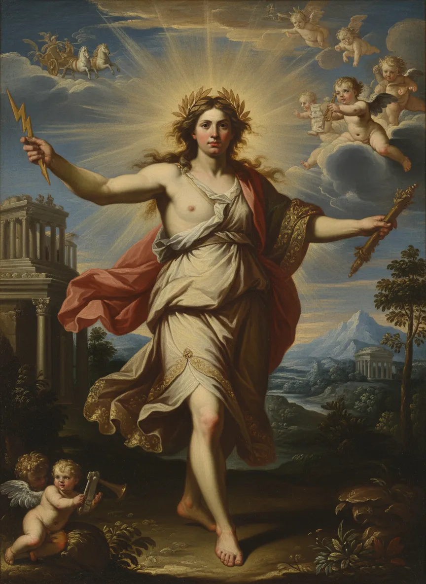 Transform the person into a Greek god in baroque classical painting style, maintaining natural skin and facial identity, radiant golden divine light, cinematic soft glow, mythological backdrop, subtle laurel details, and a dramatic heroic portrait pose.