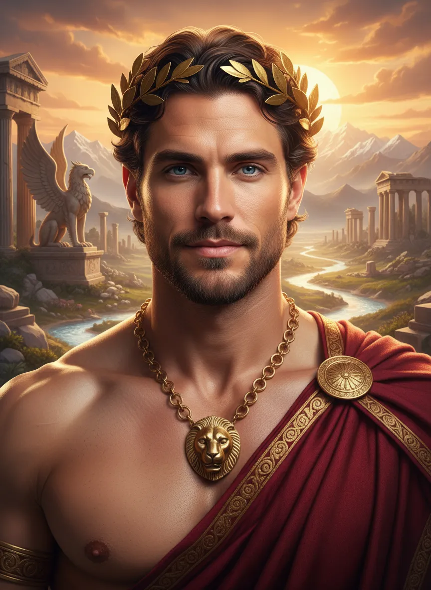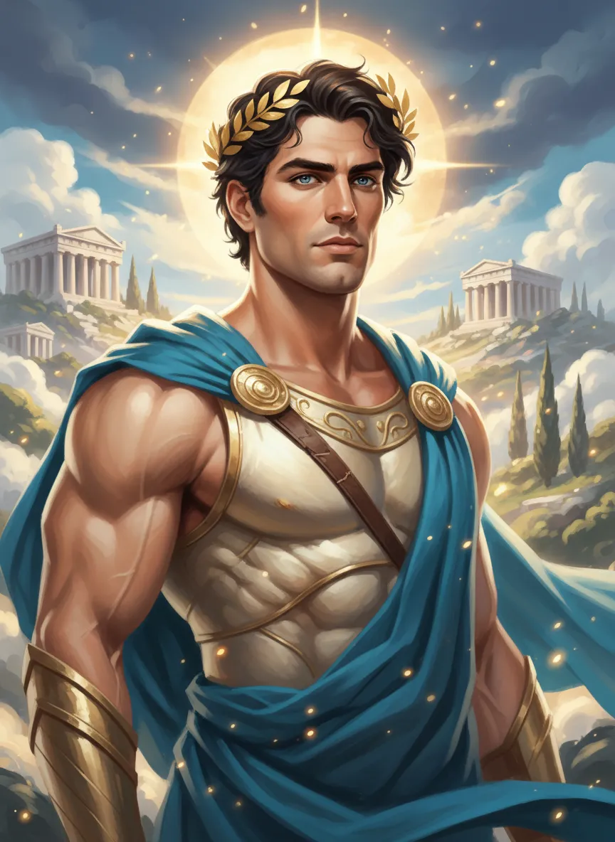 Describe your ideal Greek god portrait, including appearance, theme, aura, clothing, expression, background, and symbolic elements. The more details you give, the more accurate the final portrait becomes.