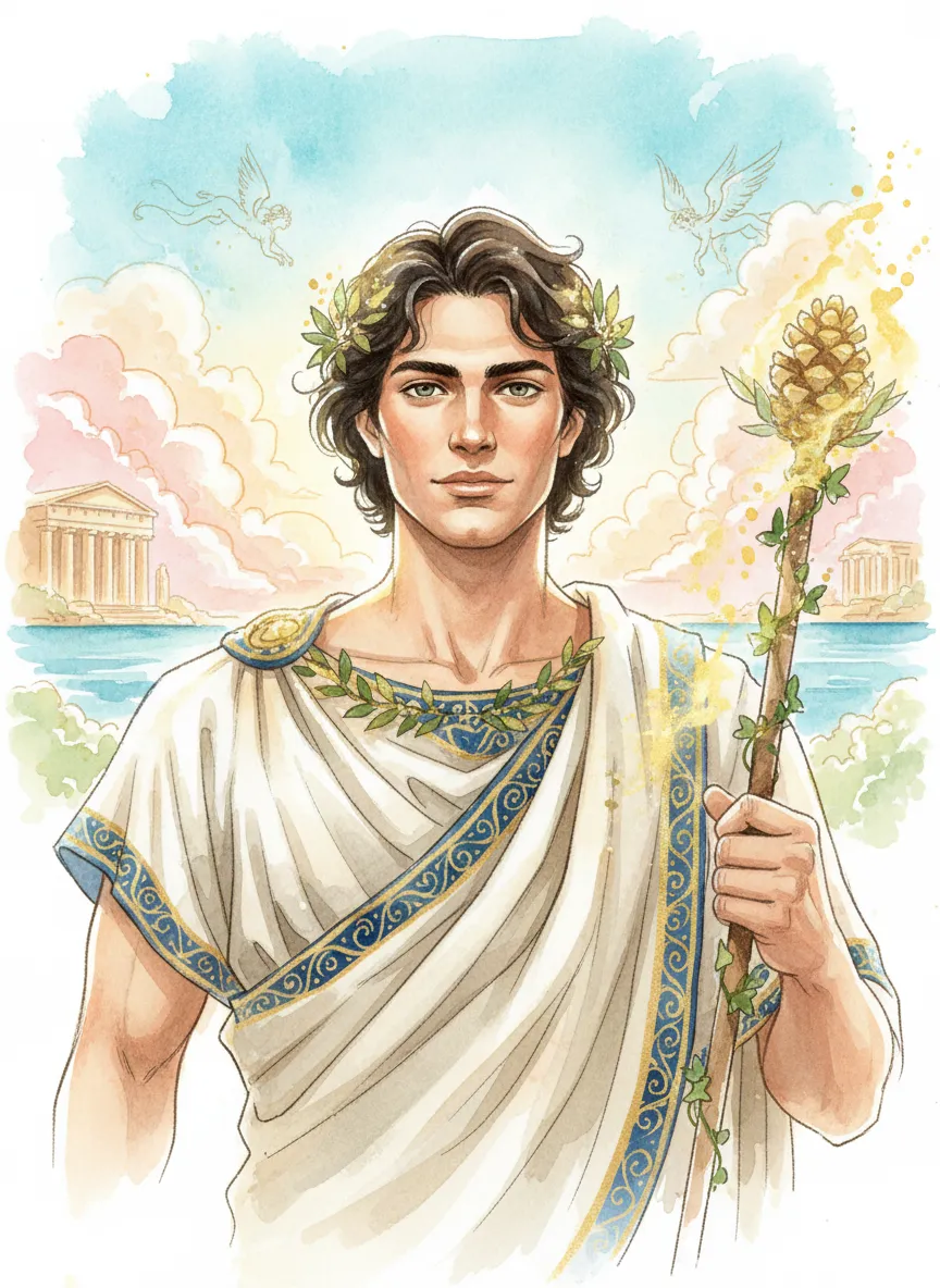 Illustrate the person as a Greek god in soft watercolor style, keeping the same facial identity and natural skin, golden divine highlights, gentle cinematic glow, myth-inspired background, subtle laurel accents, and a heroic yet delicate portrait style.