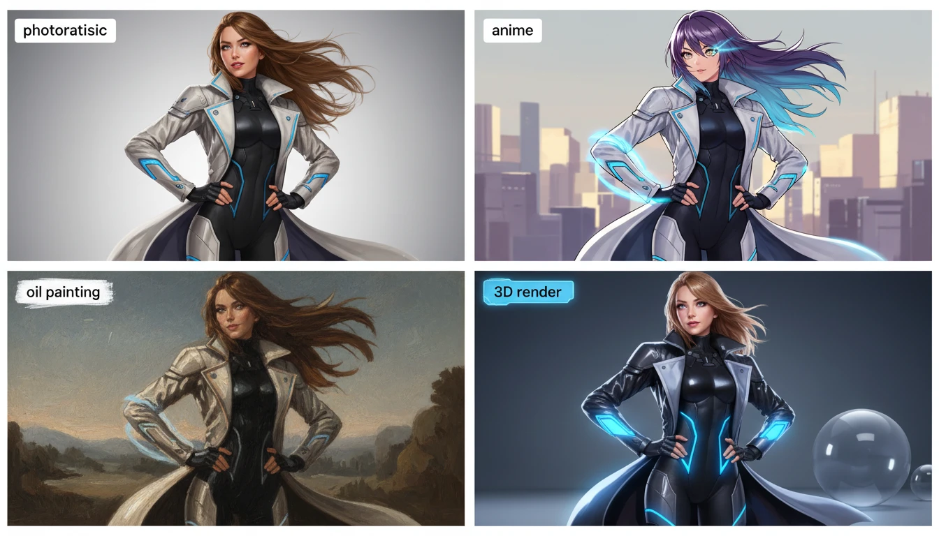 Users can control visual style directly from text such as cinematic, anime, oil painting, 3D render, cyberpunk, fantasy, or photorealistic by simply describing the desired look in the prompt.